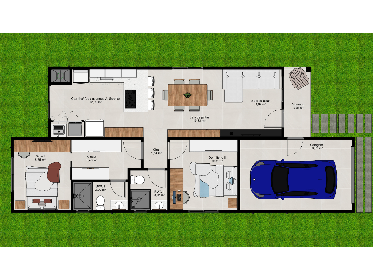 Casa Mencia entrega 92 m² de conforto e funcionalidade em um projeto elegante e bem distribuído. Conta com suíte com closet, dormitório adicional, dois banheiros, sala de estar e jantar integradas à cozinha e área gourmet, além de lavanderia e garagem coberta.