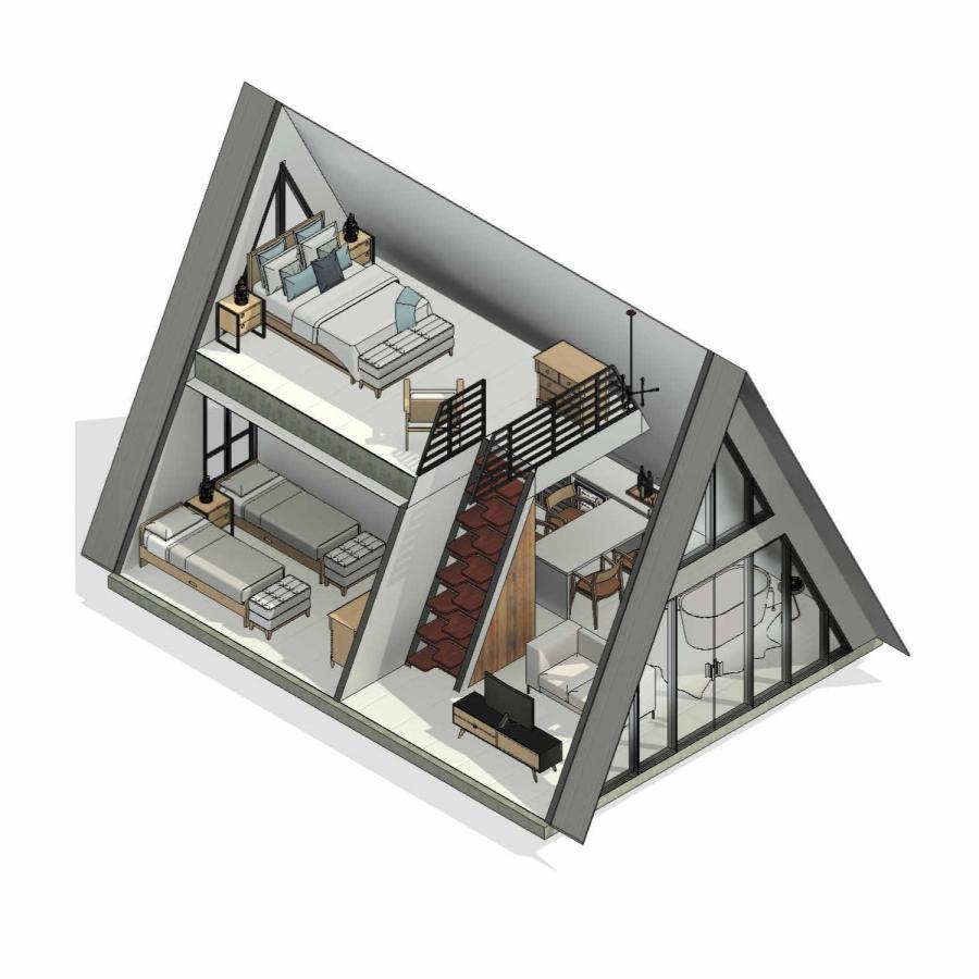 O interior é finalizado com forro em PVC amadeirado, painéis WPC e lã PET, garantindo isolamento superior e fácil limpeza. Tubulações PEX e janelas de alumínio preto oferecem mais durabilidade e menos manutenção. O resultado é um chalé de construção rápida, economia de energia e o aconchego ideal para curtir momentos especiais.